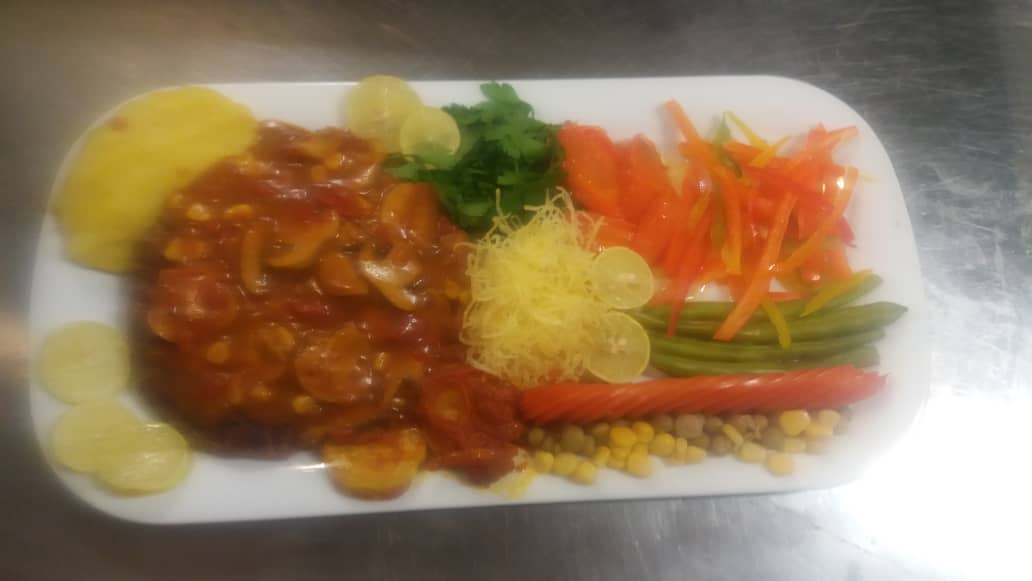 فیله گوساله 125 گرم ، استیک سینه مرغ 125 گرم ، سس قارچ مخصوص ، خلال چیپس ، دور غذایی گرم ( هویج – گل کلم – کلم بروکلی – نخود فرنگی – کدو ) پخته شده